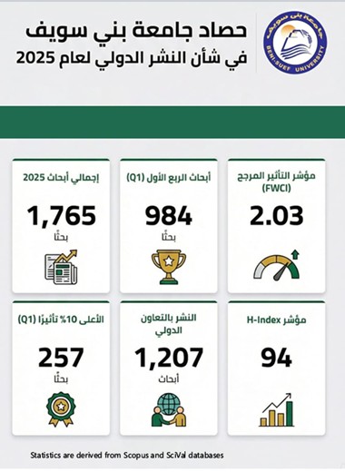 جامعة بني سويف تعلن نشر 1765 بحث علمي بمجلات دولية خلال 2025