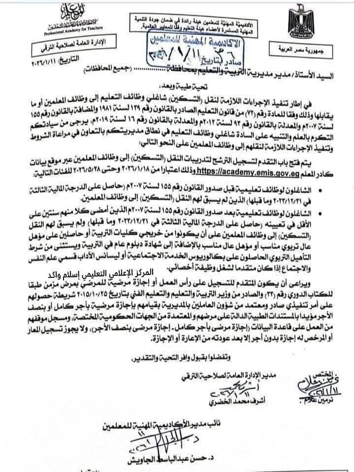 أصدرت أكاديمية المعلمين خطابًا رسميًا إلى المديريات التعليمية بشأن فتح باب التقدم لتسجيل الترشح لتدريبات النقل (التسكين) إلى وظائف المعلمين أو ما يقابلها، عبر موقع بيانات كادر المعلم، وذلك اعتبارًا من 18 يناير 2026.