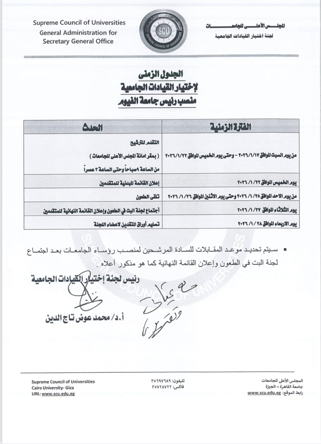أعلن المجلس الأعلى للجامعات الجدول الزمني للجنة اختيار القيادات الجامعية وفتح باب الترشح لمنصب رئيس جامعة الفيوم، لتبدأ يوم السبت المقبل 17 يناير ويستمر إتاحة التقدم حتى يوم الخميس 22 يناير الجاري.