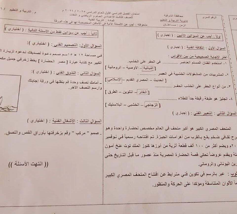 تداول امتحان مادة التربية الفنية الشهادة الإعدادية الترم الأول 2026 الشرقية