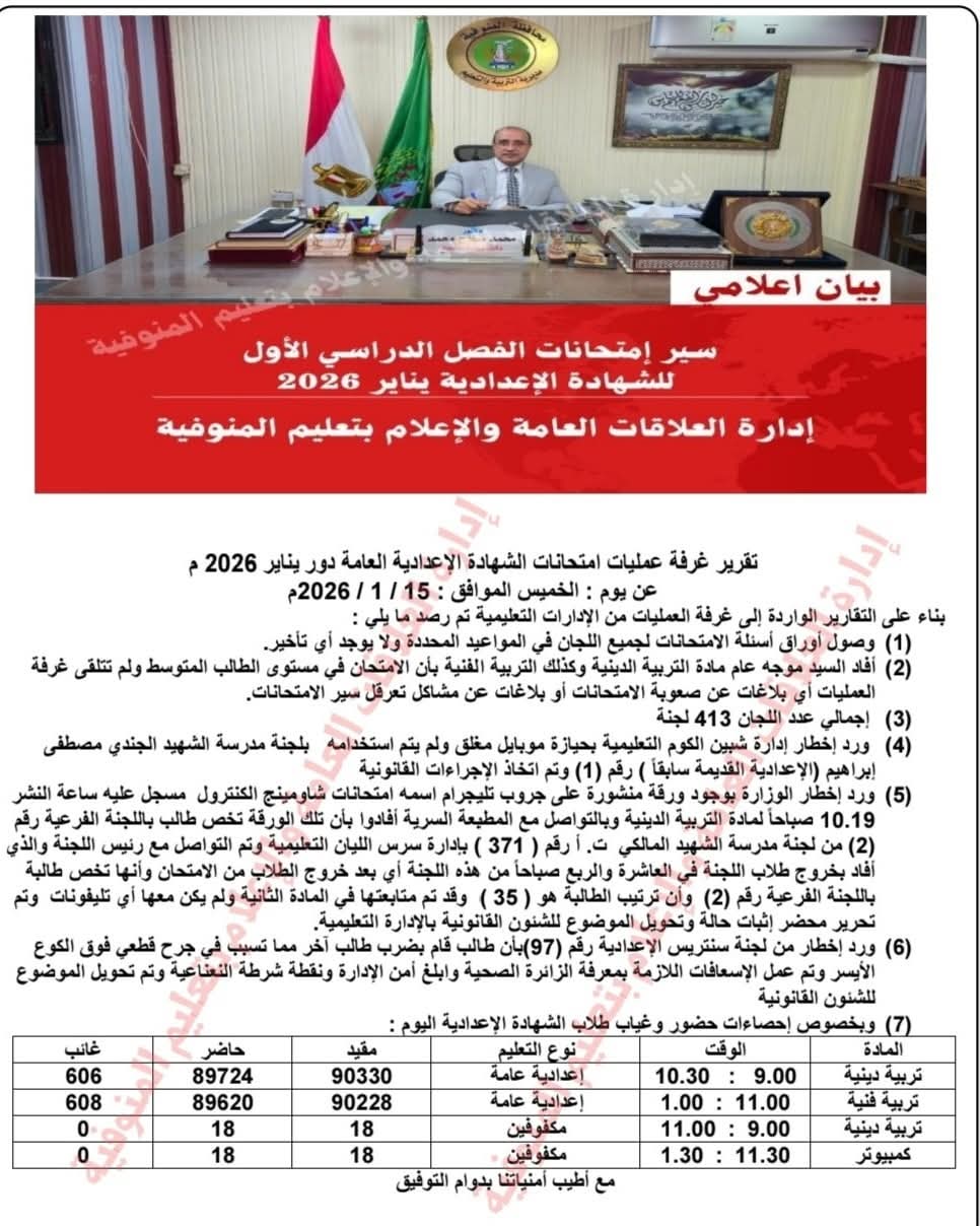 وأوضحت أنه تم التواصل مع المطبعة السرية أفادوا بأن تداول امتحان الدين للشهادة الإعدادية الترم الأول 2026 بالمنوفية، تخص طالبة باللجنة الفرعية رقم (2) من لجنة مدرسة الشهيد المالكي ت أ رقم ( 371 ) بإدارة سرس الليان التعليمية.