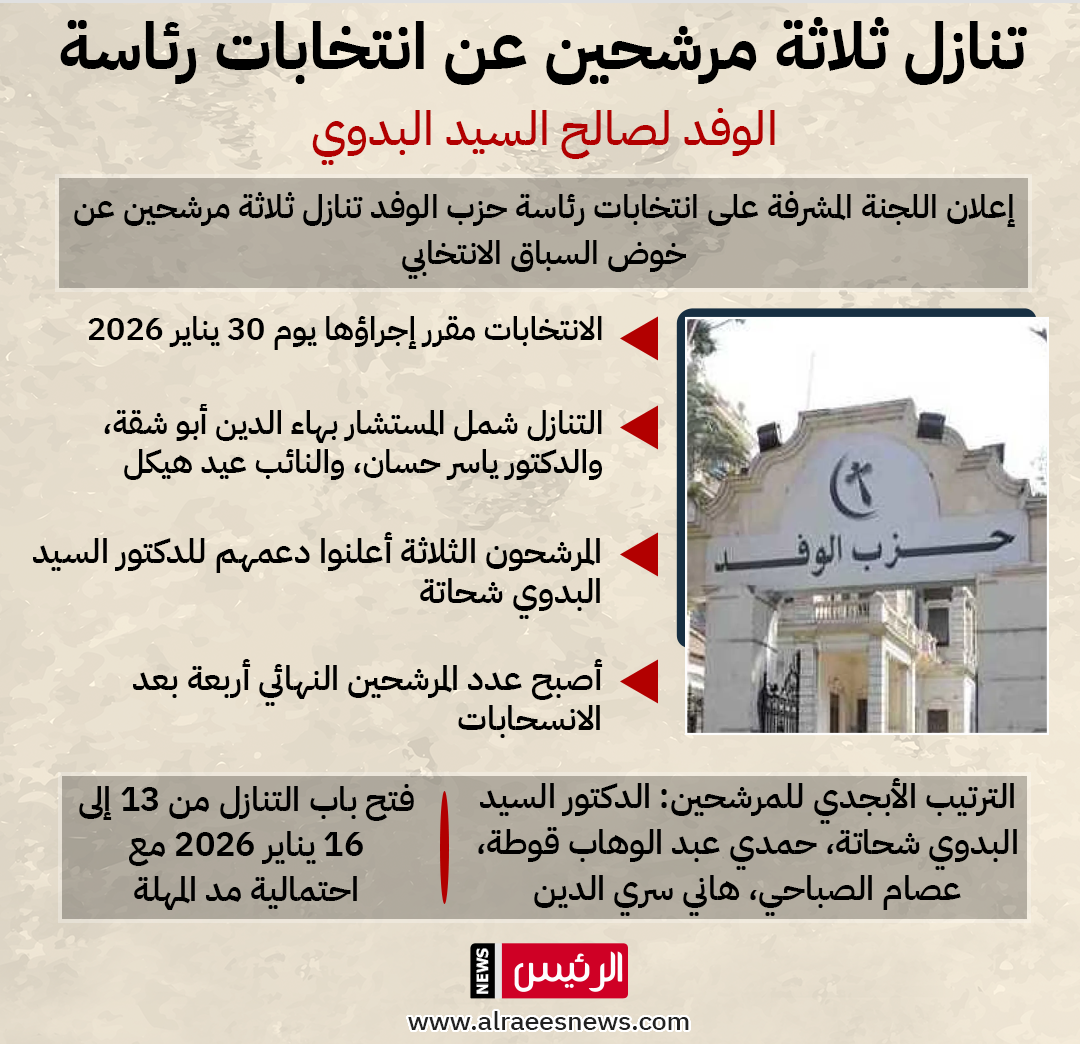 أعلنت اللجنة المشرفة على انتخابات رئاسة حزب الوفد، برئاسة النائب الوفدي المستشار طارق عبد العزيز، عن تنازل ثلاثة من المرشحين عن الترشح في الانتخابات المقرر إجراؤها يوم 30 يناير 2026، ليصبح عدد المرشحين الأربعة النهائيين في السباق الانتخابي، بعد أن أعلن المستشار بهاء الدين أبو شقة، رئيس الحزب السابق ووكيل مجلس الشيوخ الأسبق، والدكتور ياسر حسان أمين صندوق الحزب، والنائب عيد هيكل عن انسحابهم ودعمهم للمرشح الدكتور السيد البدوي شحاتة.