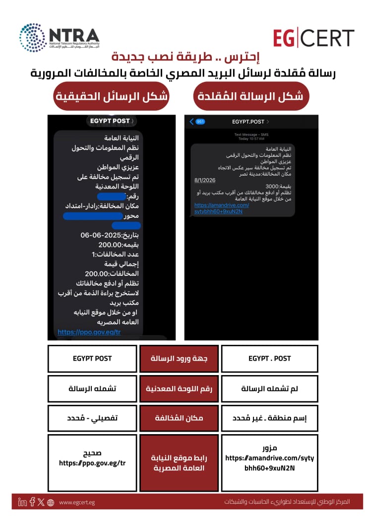 حذر المركز الوطني للاستعداد لطوارئ الحاسبات والشبكات (EGy-CERT)، التابع للجهاز القومي لتنظيم الاتصالات، من ظهور عملية احتيالية جديدة تنتحل رسائل المخالفات المرورية الصادرة عن النيابة العامة عبر البريد المصري.