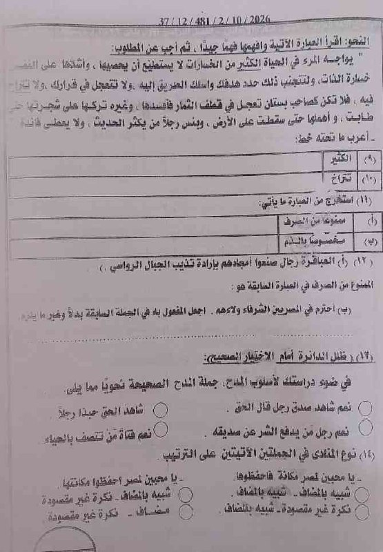 يبحث عن حل امتحان العربي تالتة اعدادي 2026 الترم الأول محافظة الدقهلية