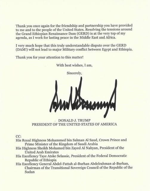 وتابع: "أشكركم مجددًا على الصداقة والشراكة التي قدمتموها لي ولشعب الولايات المتحدة، ويُعدّ حلّ التوترات المحيطة بسد النهضة الإثيوبي الكبير على رأس أولوياتي، إذ أسعى جاهدًا لتحقيق سلام دائم في الشرق الأوسط وأفريقيا. آمل بشدة ألا يؤدي هذا الخلاف المفهوم تمامًا حول سد النهضة الإثيوبي إلى صراع عسكري كبير بين مصر وإثيوبيا".