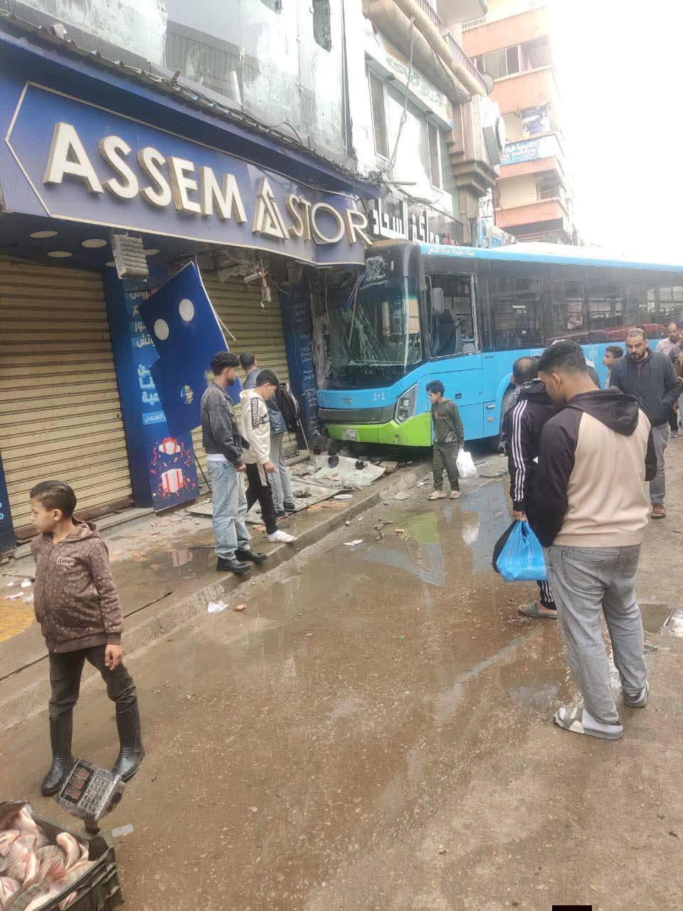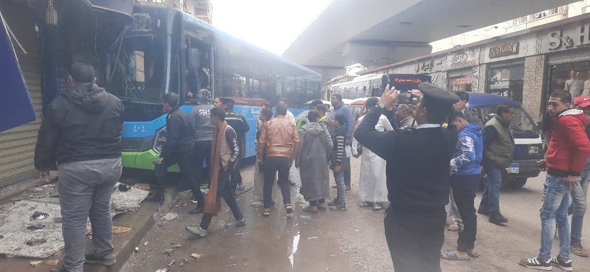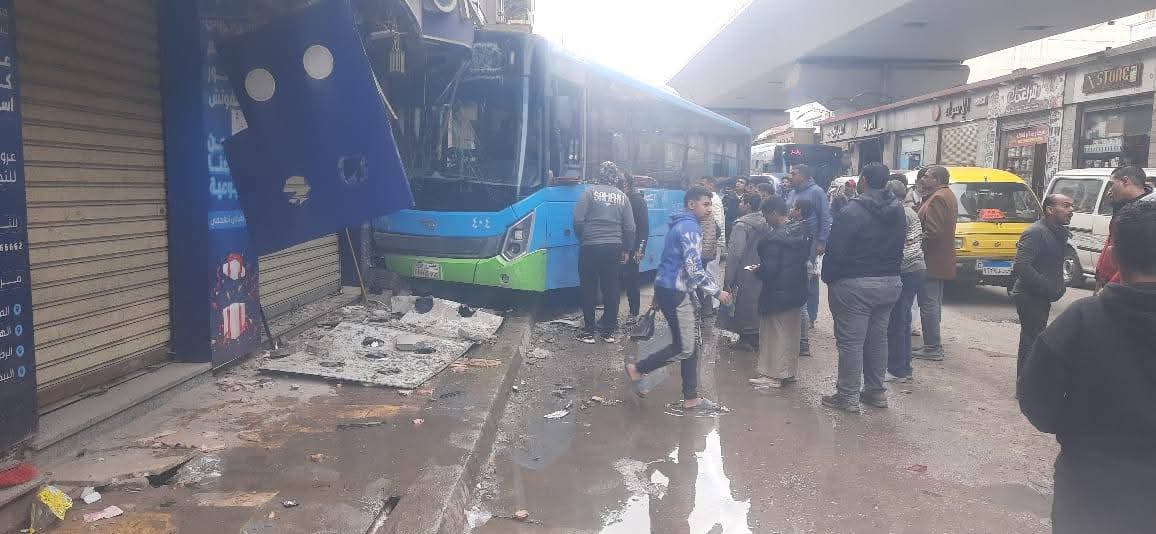 وتسبب الحادث في تلفيات كبيرة بالأتوبيس، وكذلك تلفيات خاصة في المحل التجاري، وجار رفع آثار الحادث.
