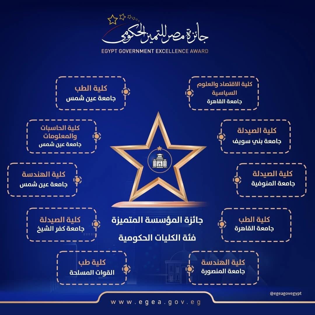 أعلنت جامعة القاهرة عن اختيار كلية الاقتصاد والعلوم السياسية وكلية طب قصر العيني ضمن الكليات الحكومية العشر التي تأهلت للمنافسة على المراكز الثلاثة الأولى في جائزة مصر للتميز الحكومي – فئة الكليات الحكومية، وذلك من بين 326 كلية حكومية مرشحة على مستوى الجمهورية، وفي إطار توجه الدولة نحو ترسيخ ثقافة التميز المؤسسي والارتقاء بجودة الأداء في مؤسسات التعليم العالي.