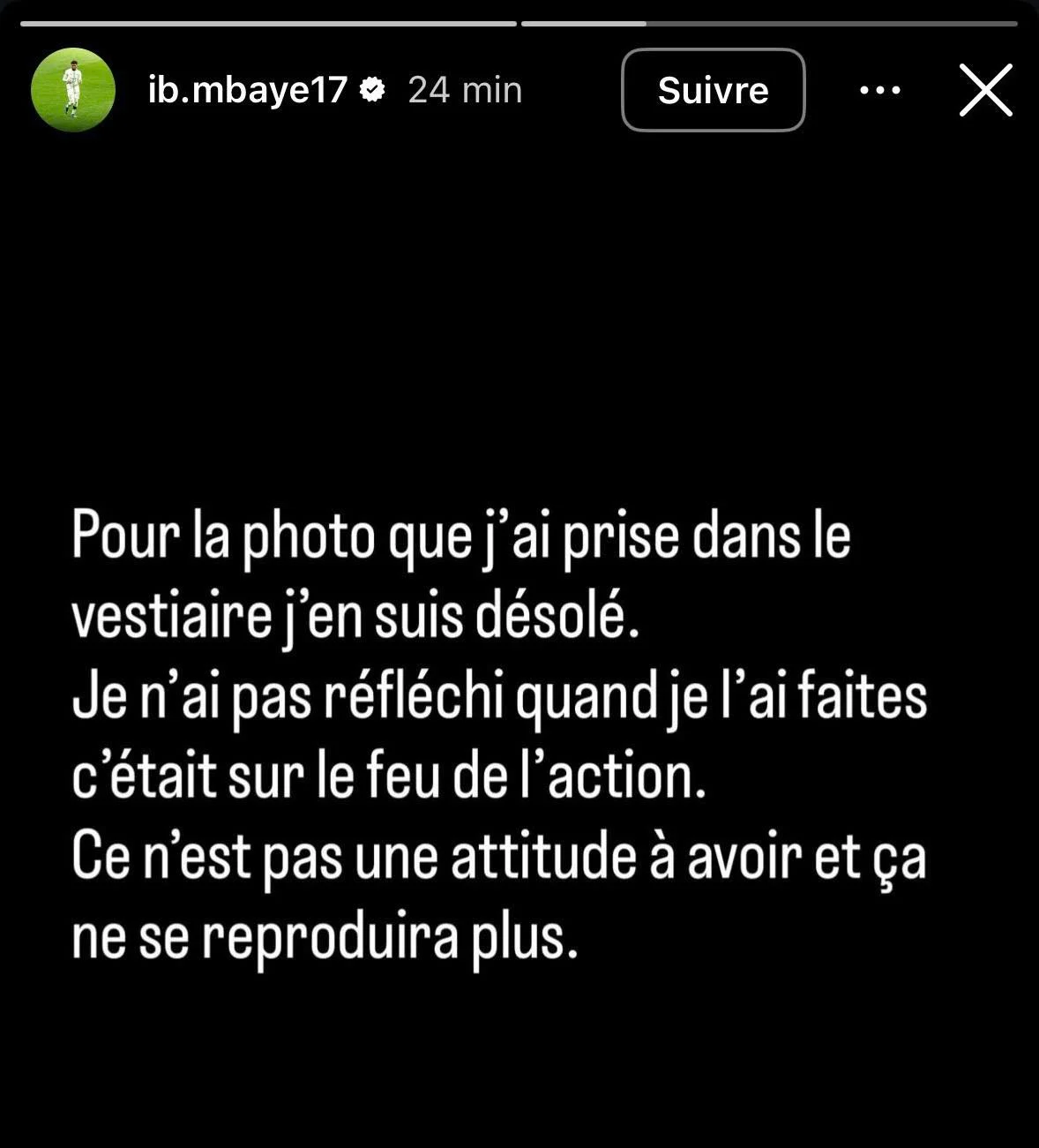 وقال إبراهيم مباي، عبر حسابه الرسمي على موقع «إنستجرام»: «أعتذر عن الصورة التي التقطتها داخل غرفة الملابس، لم أفكر جيدًا وقتها، فقد كانت لحظة انفعال. هذا تصرف غير لائق ولا ينبغي القيام به، ولن يتكرر مرة أخرى».