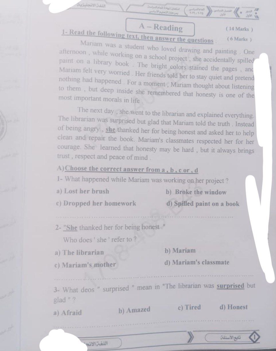 - تداول امتحان مادة اللغة الإنجليزية للشهادة الإعدادية الترم الأول 2026 المنيا