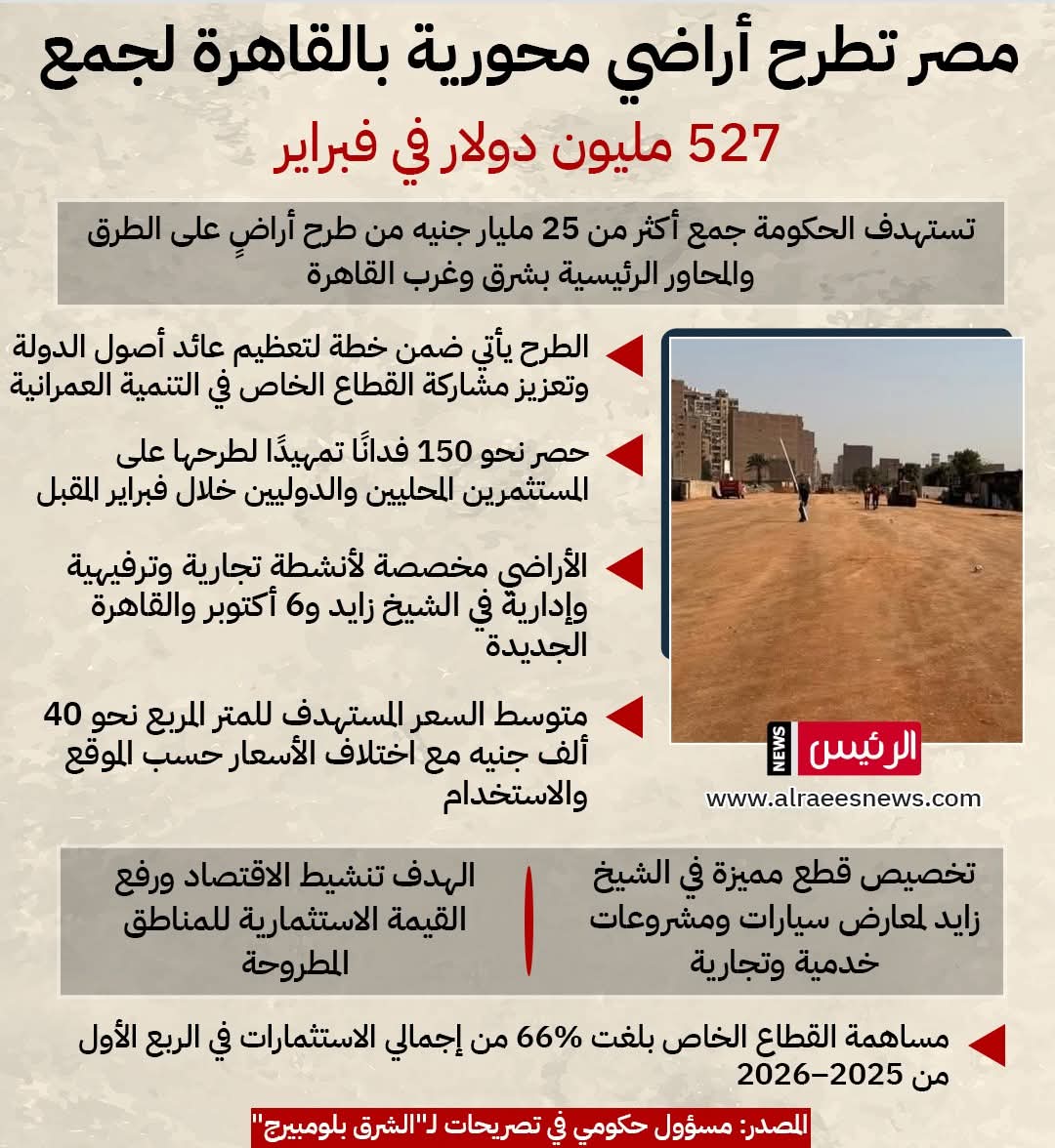 مالتى ميديا انفوجراف.. مصر تطرح أراضي محورية بالقاهرة الأربعاء 21/يناير/2026 - 12:50 ص 1/21/2026 12:50:03 AM محمد أبو مبروك طباعة مصر تطرح أراضي محورية بالقاهرة لجمع 527 مليون دولار في فبراير. facebook twitter whats شارك مصر القاهرة