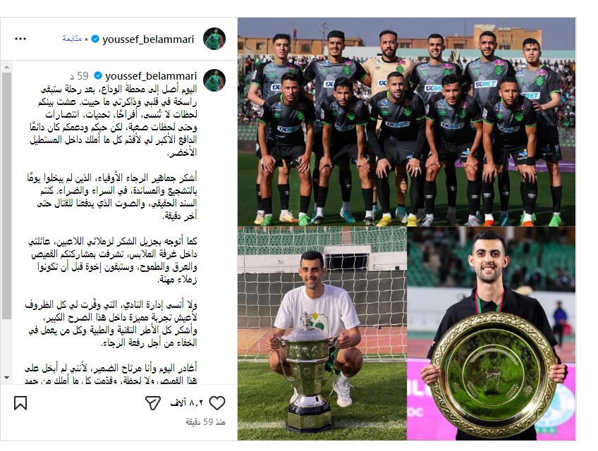 وجّه المغربي يوسف بلعمري، الظهير الأيسر السابق لنادي الرجاء، رسالة وداع مؤثرة لجماهير الفريق قبل انضمامه رسميًا إلى صفوف النادي الأهلي المصري.