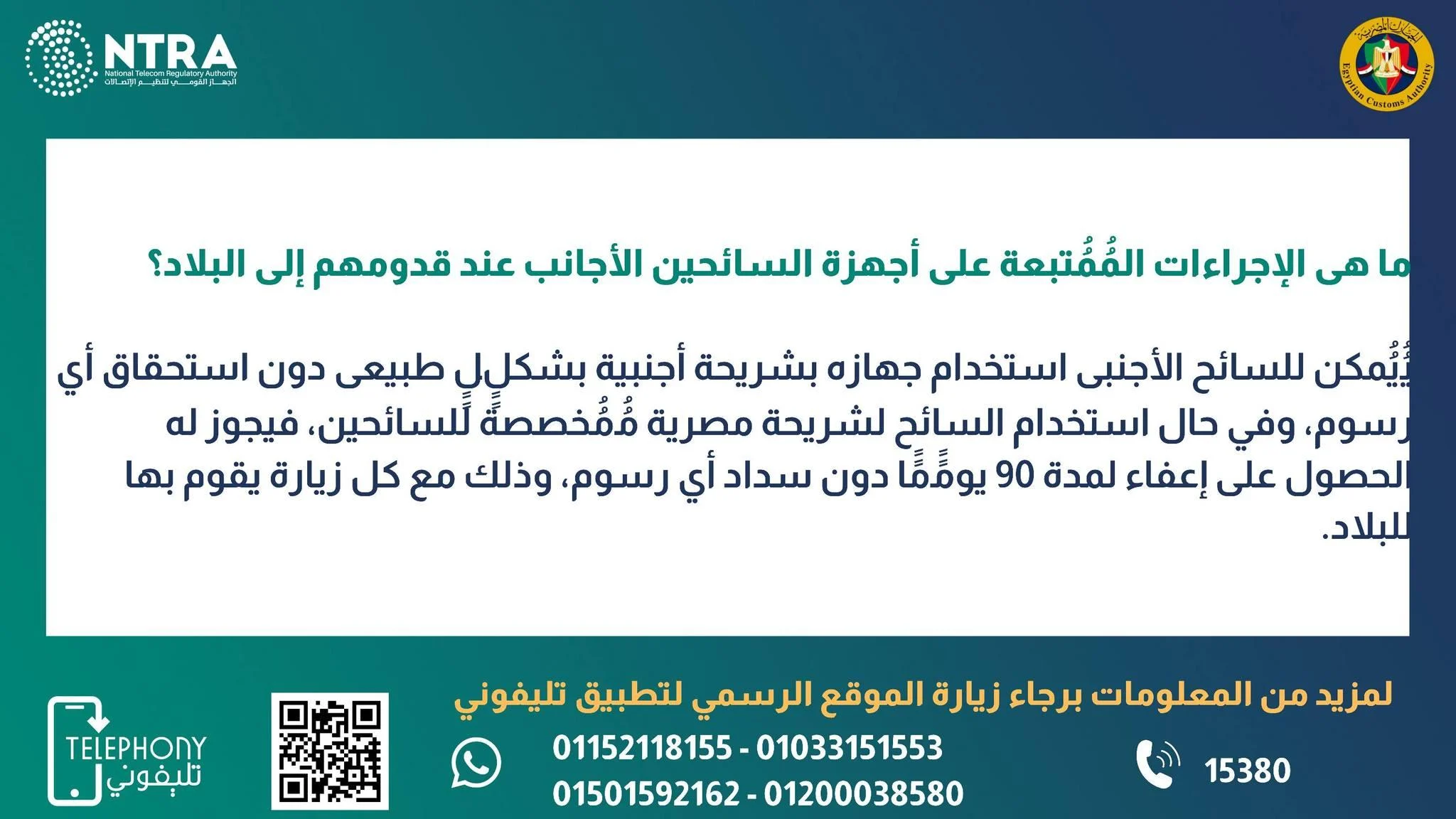 ودعت الجمارك، الراغبين في الحصول على مزيد من المعلومات والتفاصيل التقنية إلى زيارة الموقع الرسمي لتطبيق "تليفوني" (Telephony)، أو التواصل عبر الخط الساخن 15380، كما تم تخصيص أرقام "واتساب" للرد على استفسارات الزوار والمستخدمين وهي: