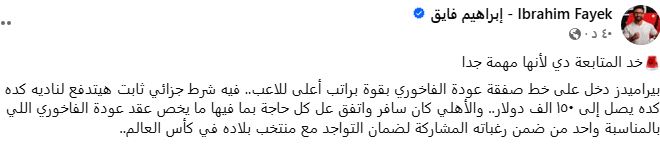 وكتب فايق عبر حسابه الرسمي على فيسبوك "بيراميدز دخل على خط صفقة عودة الفاخوري بقوة براتب أعلى للاعب.. فيه شرط جزائي ثابت هيتدفع لناديه كده كده يصل إلى 150 ألف دولار".