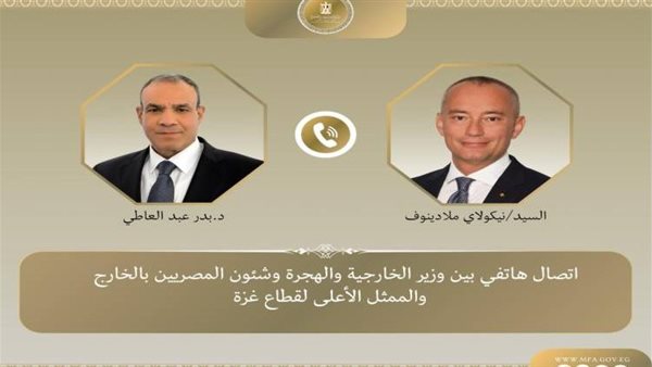 جرى اتصال هاتفي بين الدكتور بدر عبد العاطي، وزير الخارجية والهجرة وشئون المصريين بالخارج، والسيد نيكولاي ملادينوف، الممثل الأعلي لقطاع غزة، تناول آخر مستجدات الأوضاع في القطاع، والجهود الجارية لدعم تنفيذ المرحلة الثانية من خطة الرئيس الامريكى.