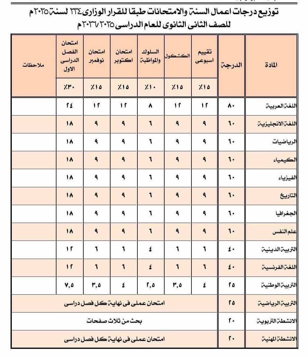 وكانت وزارة التربية والتعليم والتعليم الفني، قد أعلنت توزيع درجات تقييم طلاب الصف الأول الثانوي العام والبكالوريا للعام الدراسي الحالي 2025/2026، والتي جاءت كالتالي:
