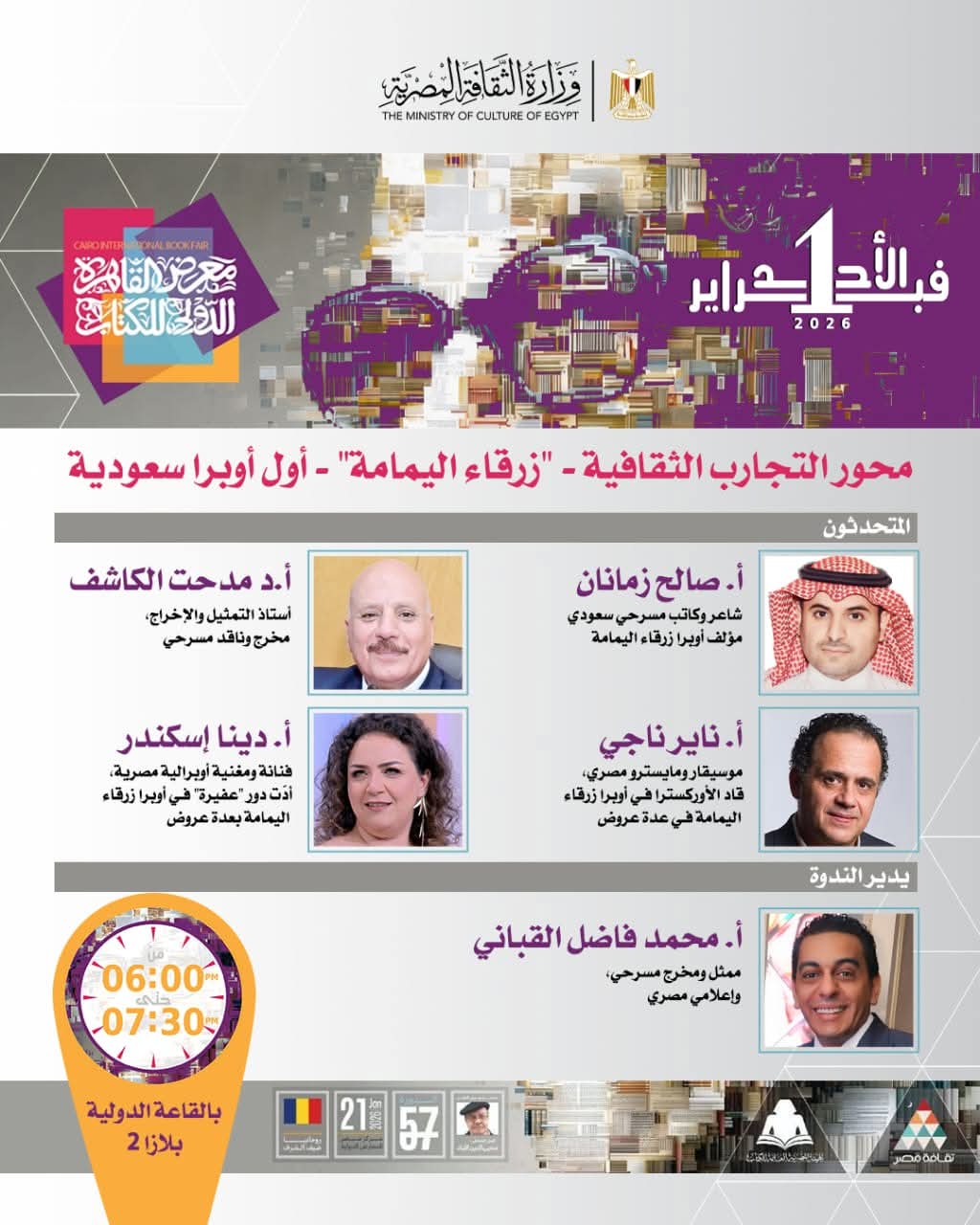 يعقد معرض القاهرة الدولي للكتاب 2026، يوم الأحد المقبل، ندوة خاصة لمناقشة تجربة "أوبرا زرقاء اليمامة" بوصفها أول أوبرا سعودية، وذلك ضمن محور التجارب الثقافية.