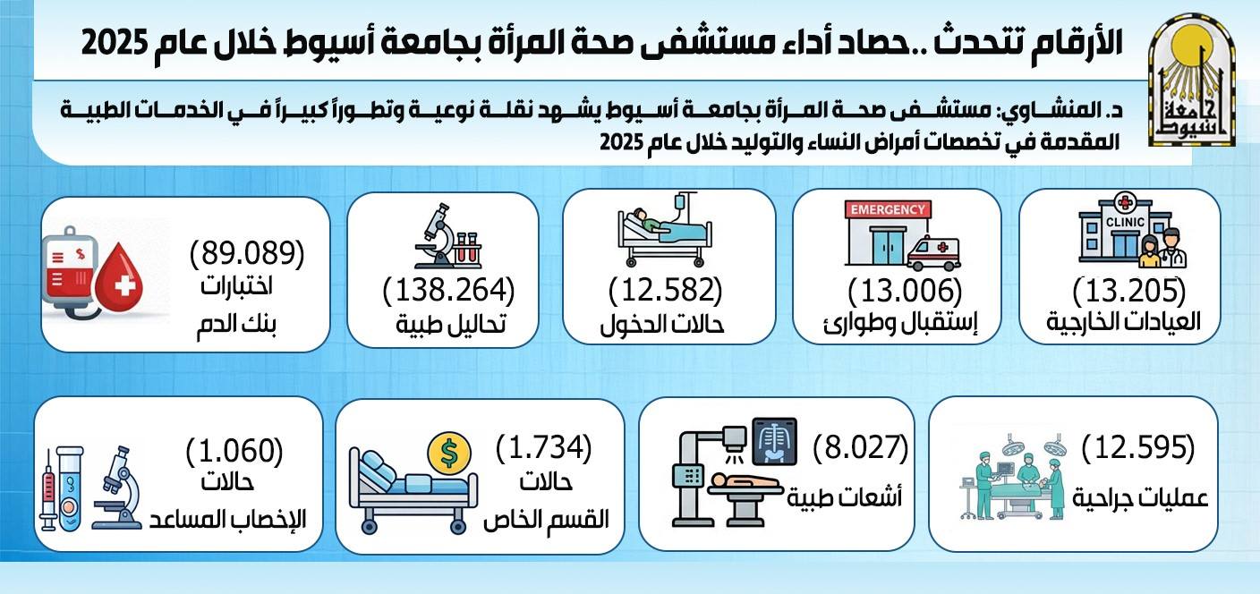 وأوضح رئيس جامعة أسيوط، أن مستشفى صحة المرأة الجامعي استقبل خلال عام 2025 عدد (13.205) حالة بالعيادات الخارجية، إلى جانب (13.006) حالة بقسم الاستقبال والطوارئ، فيما سجل المستشفى (12.582) حالة دخول، كما بلغ عدد المترددين من مختلف المحافظات المصرية والدول العربية (12.592) حالة، وهو ما يعكس تميز المستشفى في تقديم الرعاية الطبية المتكاملة للحالات الحرجة والدقيقة في تخصصات أمراض النساء والتوليد، وجراحات المناظير، وأمراض الأجنة.