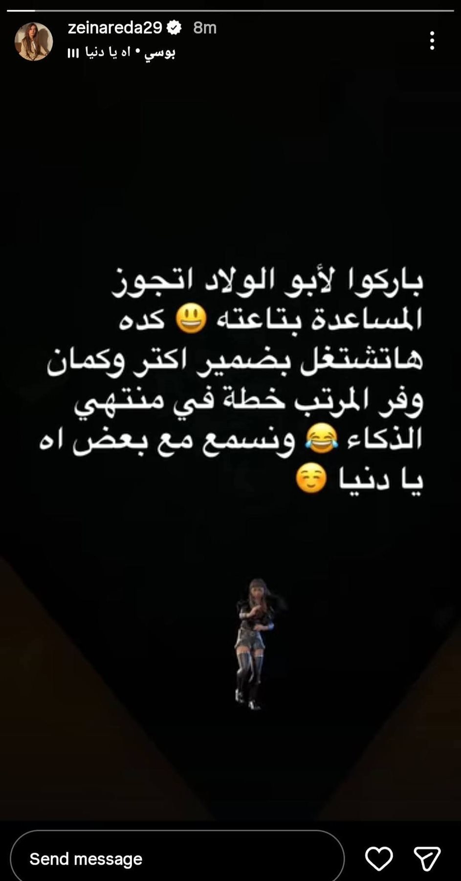 وكتبت زينة: “باركوا لأبو الولاد اتجوز المساعدة بتاعته وكده وفر مرتبها خطة في منتهي الذكاء ونسمع مع بعض اه يا دنيا".