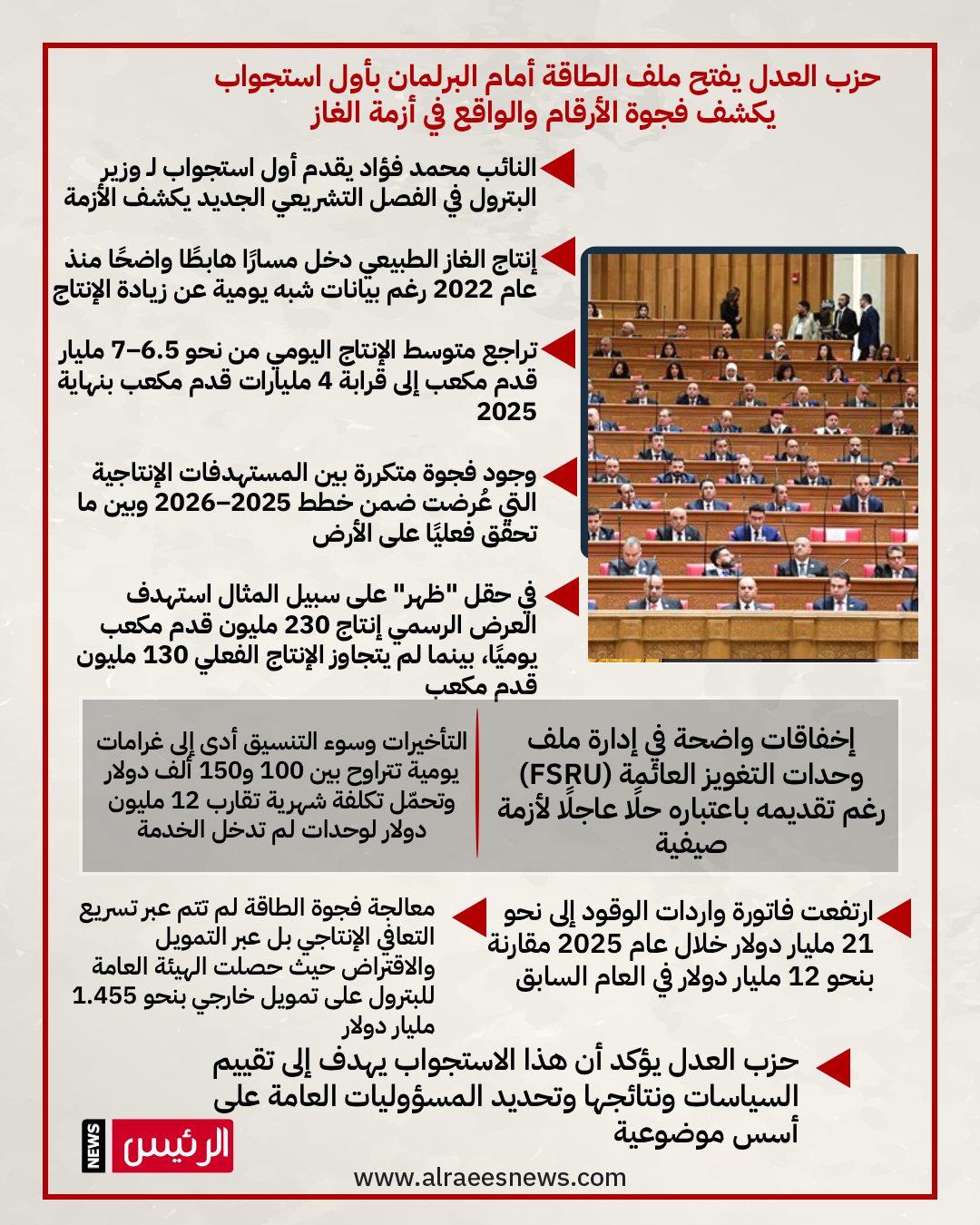 مع افتتاح الفصل التشريعي الجديد، تقدّم حزب العدل عبر نائبه محمد فؤاد بأول استجواب في هذا الفصل، موجَّه إلى وزير البترول والثروة المعدنية، بشأن أزمة الغاز والطاقة، باعتبارها ملفًا سياديًا ترتبت عليه آثار مباشرة على الأمن الطاقي، والاستقرار المالي، والقدرة الإنتاجية للاقتصاد الوطني.