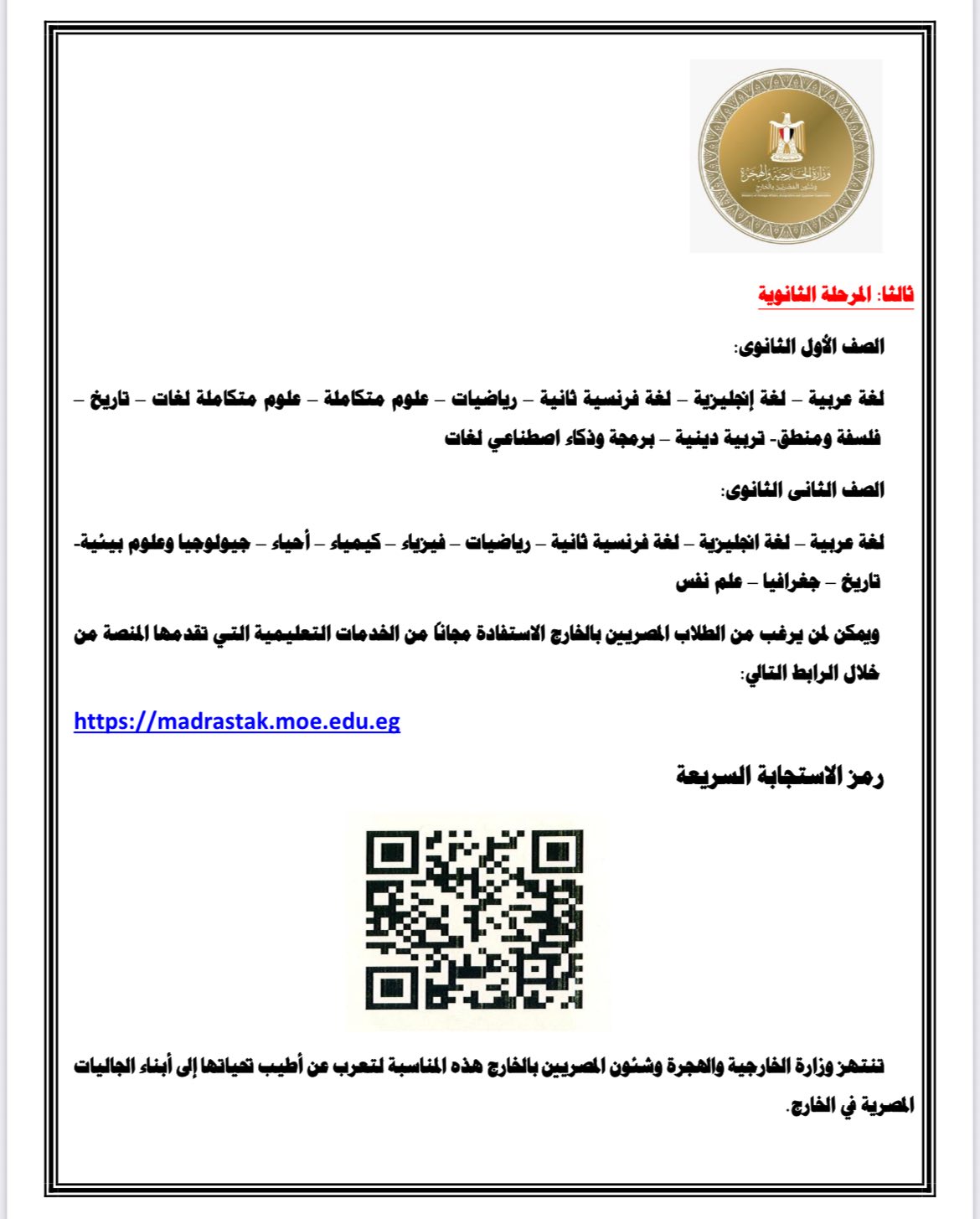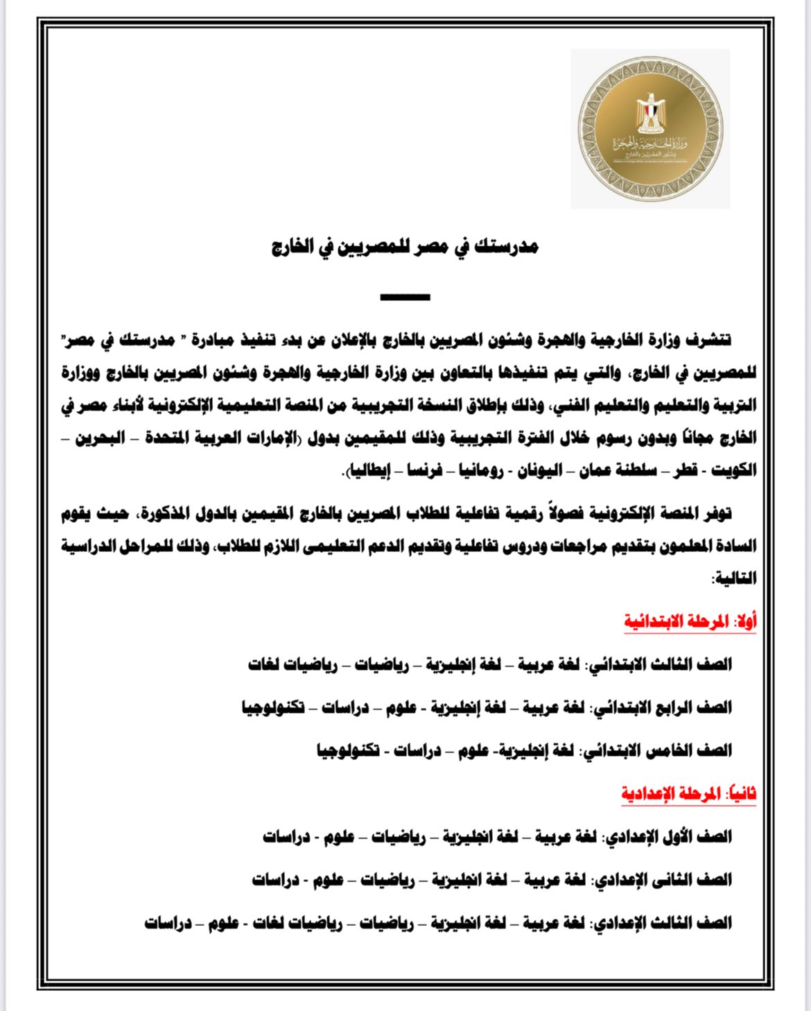 وأكدت وزارة الخارجية والهجرة وشؤون المصريين بالخارج، أن التسجيل والاستفادة من الخدمات التعليمية متاح مجانًا عبر الموقع الإلكتروني التالي: