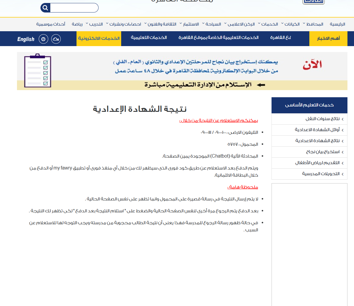 أعلنت مديرية التربية والتعليم إمكانية الحصول على نتيجة الصف الثالث الإعدادي برقم الجلوس محافظة القاهرة اليوم الخميس من خلال: