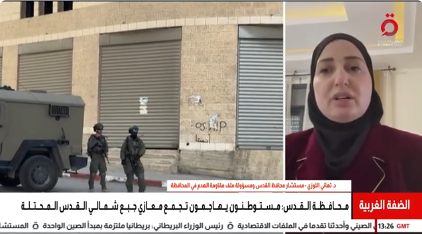 وأوضحت مستشار محافظ القدس أن المحافظة تعمل على توثيق جميع الانتهاكات والاعتداءات، ومتابعة حالات الهدم والتهجير، بالتعاون مع المؤسسات المحلية والدولية، في إطار جهودها لمقاومة سياسة التهجير القسري والحفاظ على الحقوق المدنية للسكان الفلسطينيين، مؤكدًا أن الصمود الفلسطيني في مواجهة هذه السياسات هو رسالة قوية تعكس تمسك السكان بحقهم في الأرض والحياة، رغم كل الضغوط والتحديات الأمنية.