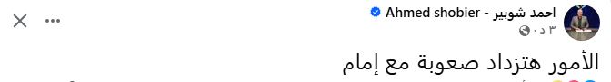 ونشر شوبير عبر حسابه على فيس بوك: "الأمور هتزداد صعوبة مع إمام"، وهو ما أثار تساؤلات كبيرة حول مصير اللاعب مع الفريق خلال الفترة المقبلة، خصوصًا بعد سلسلة الأزمات السابقة التي شهدها داخل القلعة الحمراء.
