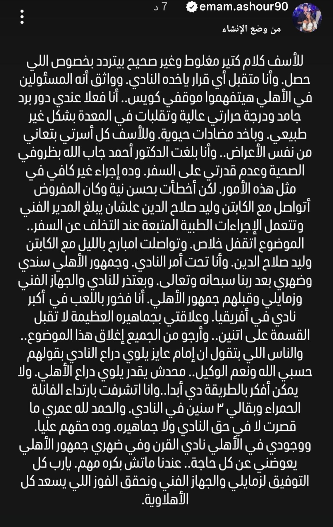 وقال عاشور، عبر حسابه الشخصي على موقع فيسبوك «للأسف كلام كثير مغلوط وغير صحيح بيتردد بخصوص اللي حصل، وأنا متقبل أي قرار ياخده النادي، وواثق إن المسؤولين في الأهلي هيتفهموا موقفي كويس».