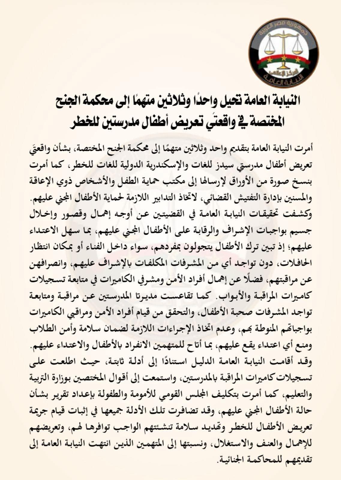 وكانت النيابة العامة قد أحالت 31 متهما بواقعتي التحرش الجنسي بالأطفال داخل مدرستي سيدز الدولية والإسكندرية للغات، لمحكمة الجنح، جاء نصه كالتالي: