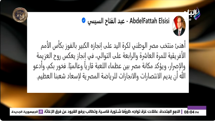 وكشف أحمد موسى، أن الرئيس عبد الفتاح السيسي حرص على تهنئة لاعبي المنتخب الوطني لكرة اليد بعد التتويج بالبطولة، معبرًا عن فخره بما قدموه من أداء مشرف أسعد الشعب المصري، قائًلا: «الرئيس السيسي قال إنه فخور برجالة اليد على انتصارهم وإسعادهم الشعب المصري»، معتبرًا أن الدعم الرئاسي يمثل دافعًا معنويًا كبيرًا لمواصلة النجاحات.