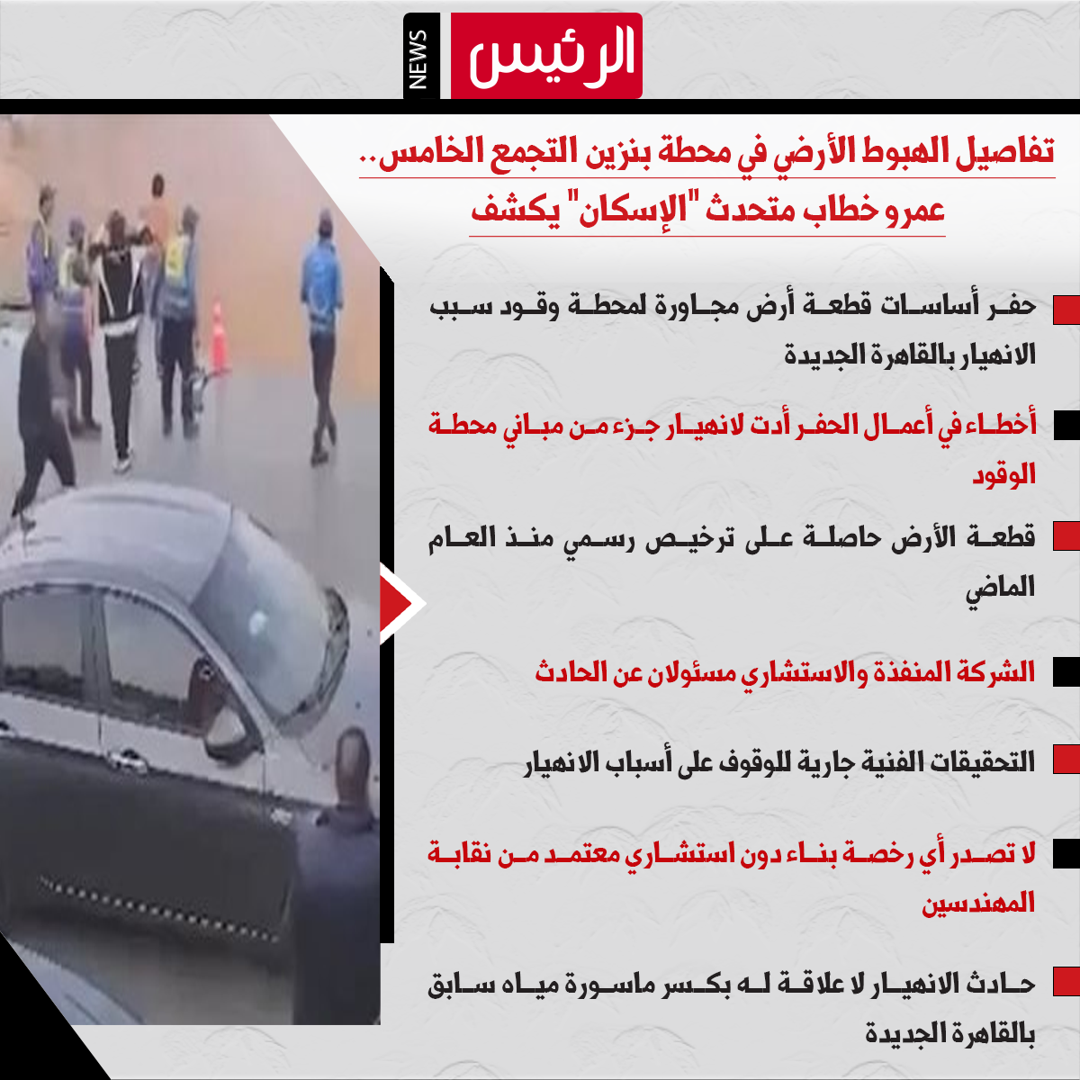 من جانبه، قال عمرو خطاب، المتحدث الرسمي باسم وزارة الإسكان، إن قطعة أرض مخصصة لإحدى الشركات مجاورة لمحطة وقود يتم البناء عليها وحفر الأساسات هي سبب الحادث.