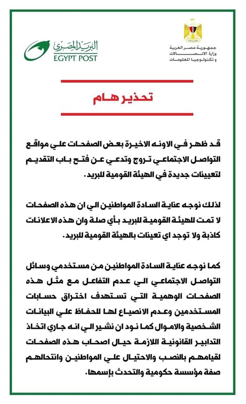 نفت الهيئة القومية للبريد، في بيان اليوم، صحة الإعلانات التي تروج لها بعض الصفحات على مواقع التواصل الاجتماعي، بشأن فتح باب التقديم لـ"تعيينات جديدة" في الهيئة.