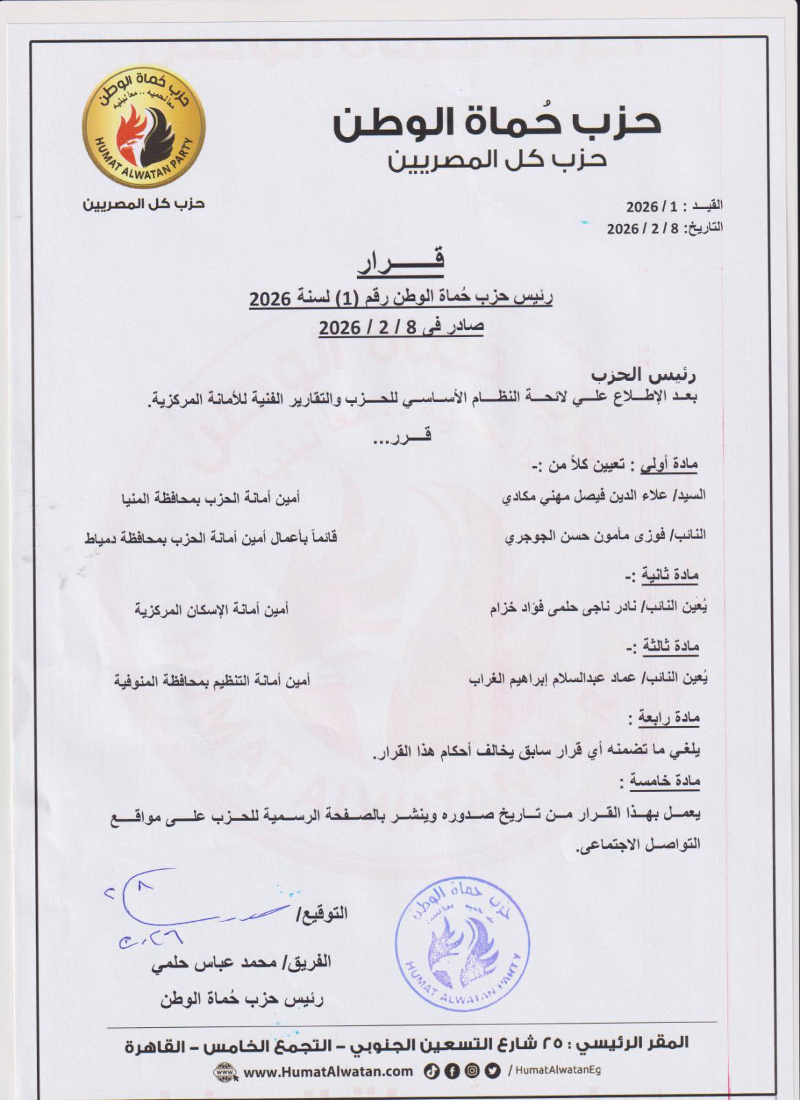 أصدر الفريق محمد عباس حلمي رئيس حزب حماة الوطن، قرارًا بتعيين كلًا من الأتي أسماؤهم بعد: