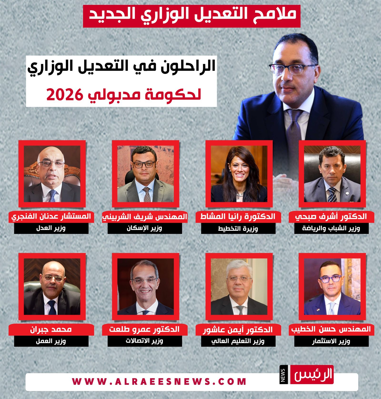 وبناءً على هذه التغييرات، تبرز قائمة الراحلين عن حكومة مدبولي لتشمل أسماء بارزة تولت مهامها لفترات متفاوتة، وفي مقدمتهم الدكتور أشرف صبحي وزير الشباب والرياضة، والدكتورة رانيا المشاط وزيرة التخطيط، والمهندس شريف الشربيني وزير الإسكان، والمستشار عدنان الفنجري وزير العدل، والمهندس حسن الخطيب وزير الاستثمار، والدكتور أيمن عاشور وزير التعليم العالي، والدكتور عمرو طلعت وزير الاتصالات، ومحمد جبران وزير العمل، والدكتور أحمد فؤاد هنو وزير الثقافة.