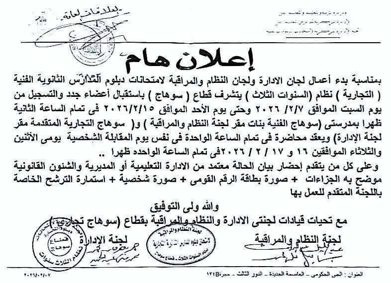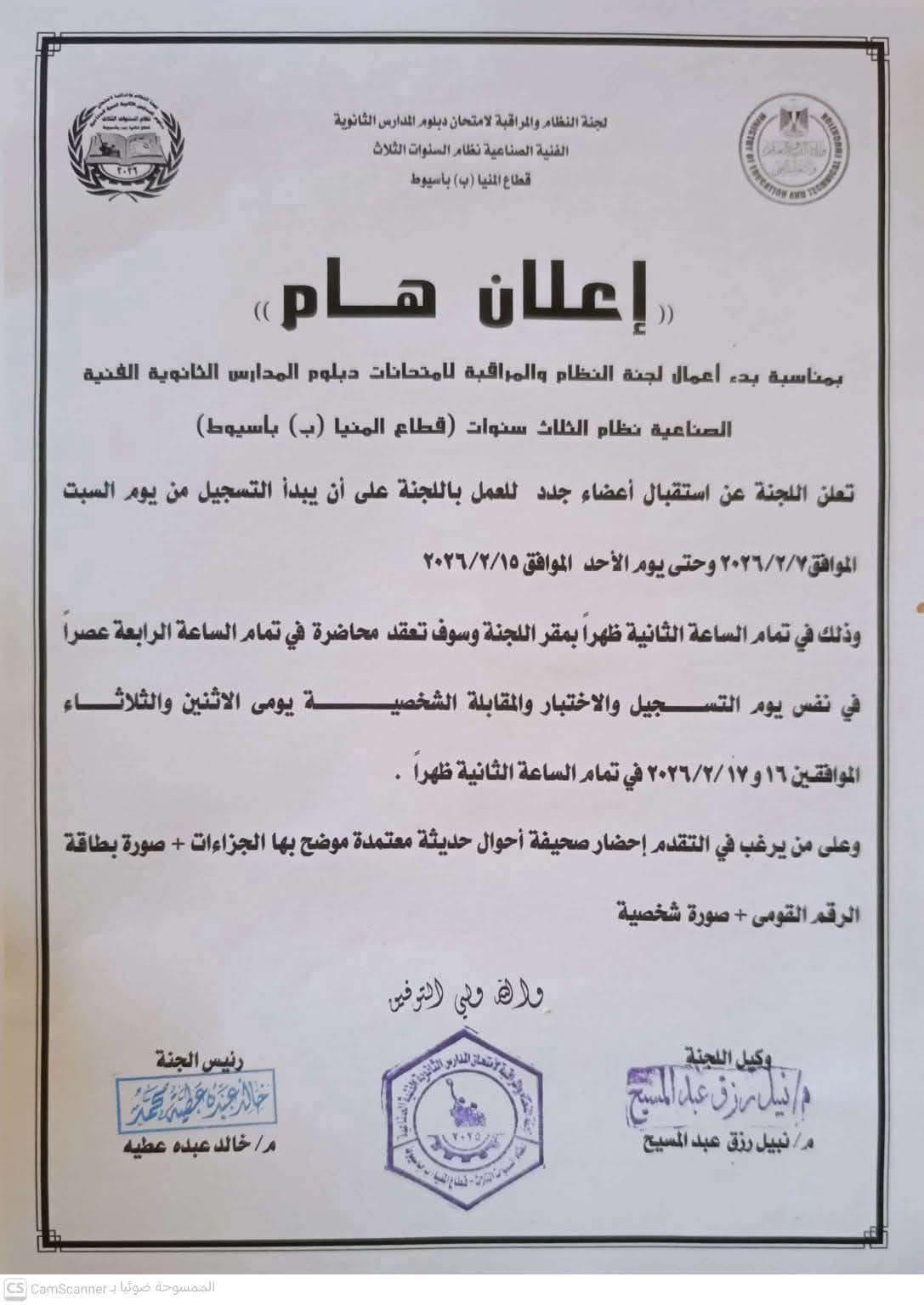 أعلنت وزارة التربية والتعليم والتعليم الفني بدء أعمال لجان الإدارة ولجان النظام والمراقبة لامتحانات الدبلومات الفنية، مع فتح باب استقبال أعضاء جدد للتسجيل اعتبارًا من السبت 7 فبراير وحتى الأحد 15 فبراير 2026، بمقر لجنة النظام والمراقبة المختصة.