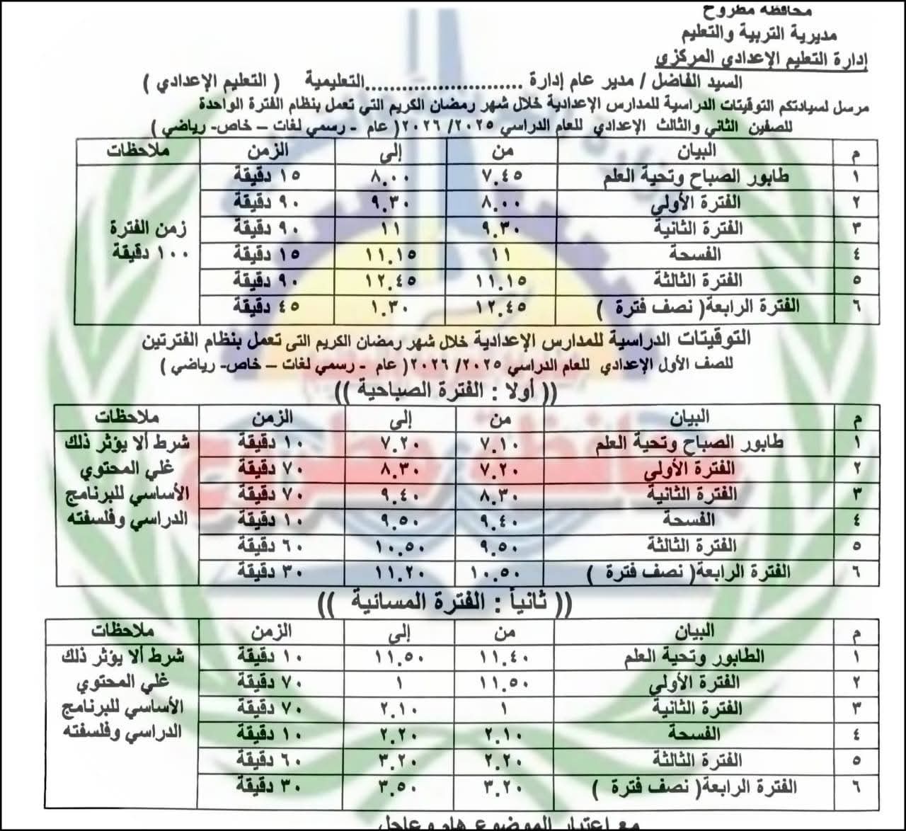 وتضمنت مواعيد الدراسة خلال شهر رمضان بمدارس مطروح بالفترة الصباحية والمسائية الآتي: