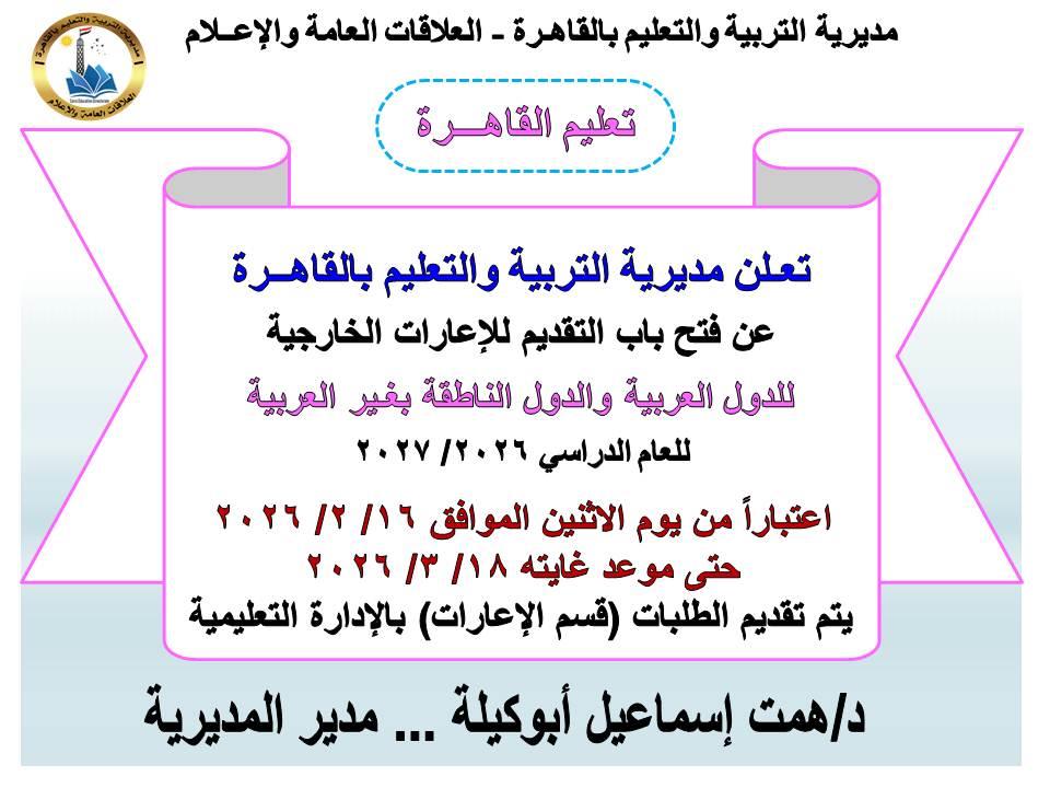 أكدت مديرية التربية والتعليم بالقاهرة برئاسة الدكتورة همت إسماعيل أبو كيلة، مدير مديرية التربية والتعليم بالقاهرة، على فتح باب التقديم للإعارات الخارجية للدول العربية والدول الناطقة بغير العربية للعام الدراسي 2026 / 2027، وذلك في إطار حرص المديرية على إتاحة فرص مهنية متميزة لأبنائها من المعلمين والإداريين.