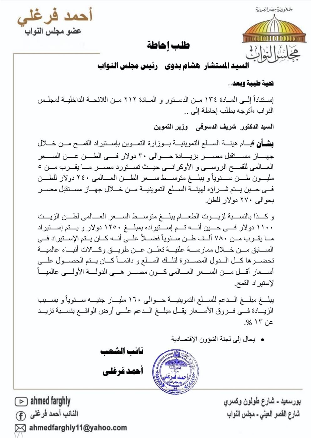 جاء ذلك عقب تقديم النائب أحمد فرغلي طلب إحاطة عاجلا موجها إلى وزير التموين والتجارة الداخلية، كشف فيه عن فروق أسعار "صادمة" في صفقات استيراد السلع الاستراتيجية.