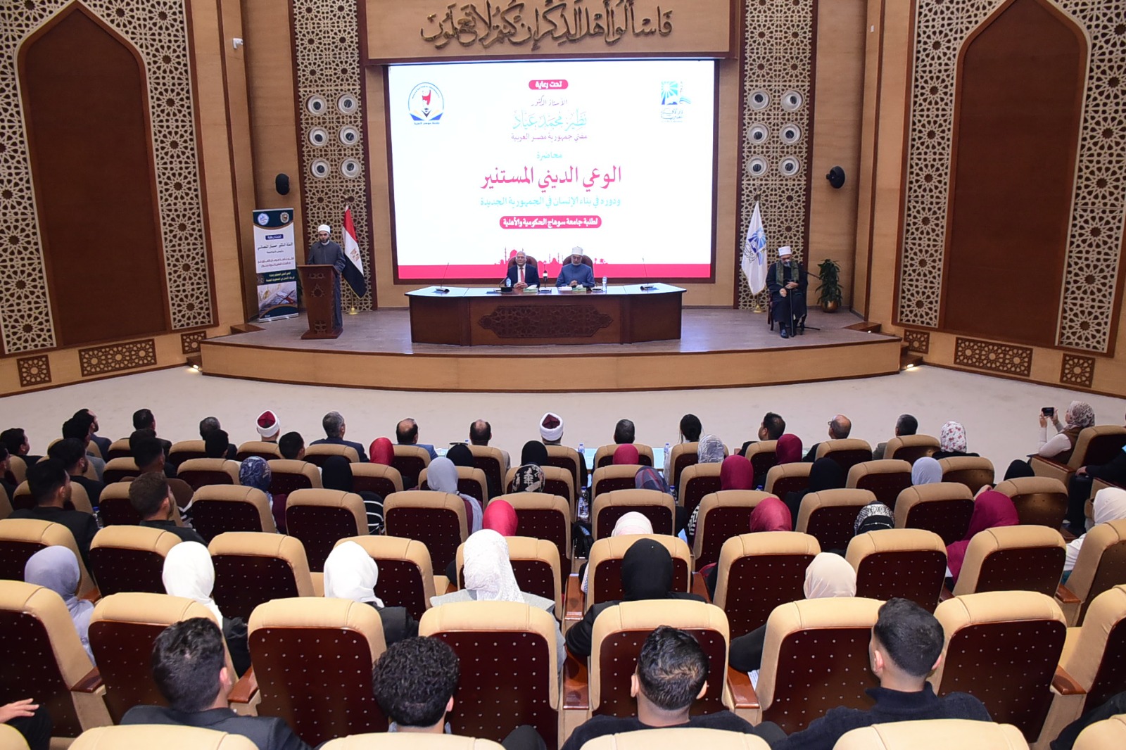 نظمت دار الإفتاء المصرية ندوة فكرية متميزة لوفد من طلاب جامعة سوهاج، برئاسة الدكتور حسان النعماني رئيس الجامعة، ألقاها فضيلة الدكتور نظير عياد، مفتي الديار المصرية، ورئيس الأمانة العامة لدور وهيئات الإفتاء في العالم، بعنوان «الوعي الديني المستنير ودوره في بناء الإنسان في الجمهورية الجديدة»، بحضور عدد من القيادات الأكاديمية وأعضاء هيئة التدريس والجهاز الإداري والطلاب، وذلك بمقر دار الإفتاء المصرية بالقاهرة.