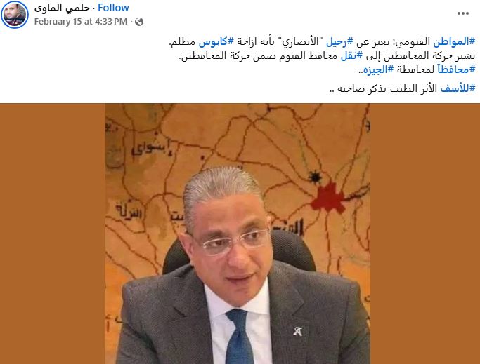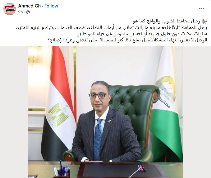 وقال أحمد: “رحيل محافظ الفيوم.. والواقع كما هو.. يرحل المحافظ تاركًا خلفه مدينة ما زالت تعاني من أزمات النظافة، ضعف الخدمات، وتراجع البنية التحتية. سنوات مضت دون حلول جذرية أو تحسين ملموس في حياة المواطنين”.