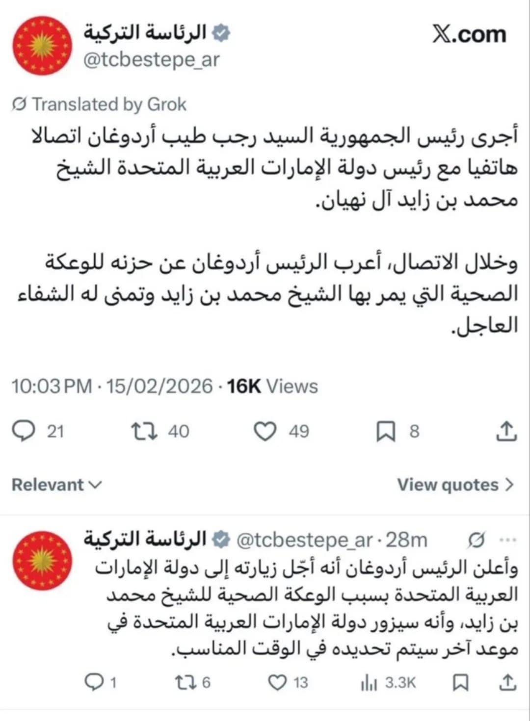 وكان من المقرر أن يحل أردوغان بالإمارات أمس الأول الاثنين، لكن تأجيل الزيارة دفع الرئاسة التركية إلى نشر تغريدة عبر موقع X تتحدث عن إجرائه اتصالا هاتفيا بمحمد بن زايد عبر من خلاله عن " حزنه إزاء العارض الصحي" الذي أصاب هذا الأخير.