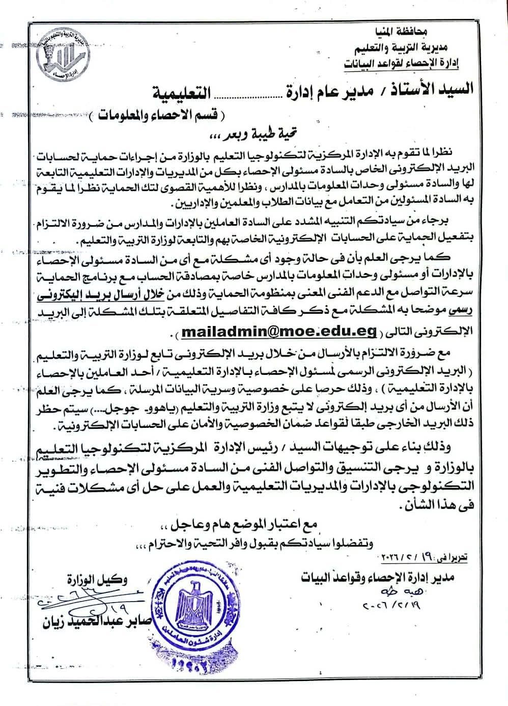 وجهت مديرية التربية والتعليم والتعليم الفني بمحافظة المنيا، تنبيها بشأن إجراءات حماية حسابات البريد الإلكتروني لمسئولي الإحصاء بالمديريات والإدارات التعليمية.