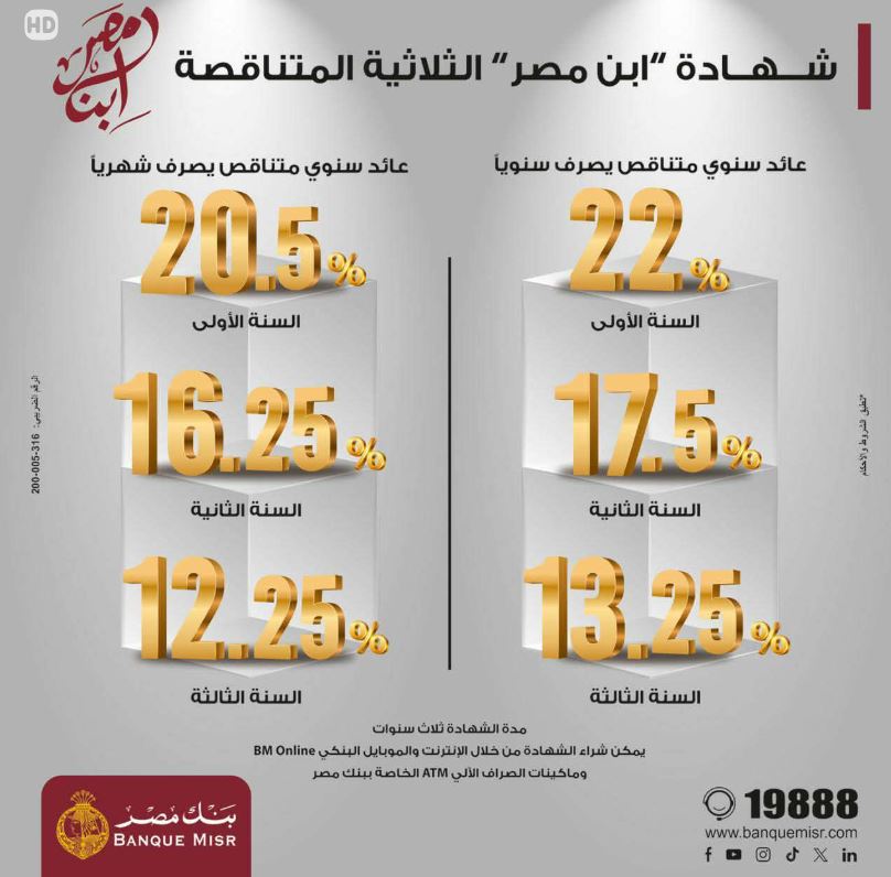 تعد شهادة الادخار الثلاثية المتناقصة «ابن مصر» لمدة 3 سنوات، من الأوعية الادخارية المتميزة والتي تتيح للعميل حرية الاختيار من دوريات صرف عائد متنوعة شهريًا وسنويًا، بالإضافة الى عوائد تنافسية متنوعة؛ حيث يبلغ العائد بدورية صرف سنويًا إلى %22.00 في السنة الأولى، و%17.50 في السنة الثانية، و%13.25 في السنة الثالثة.