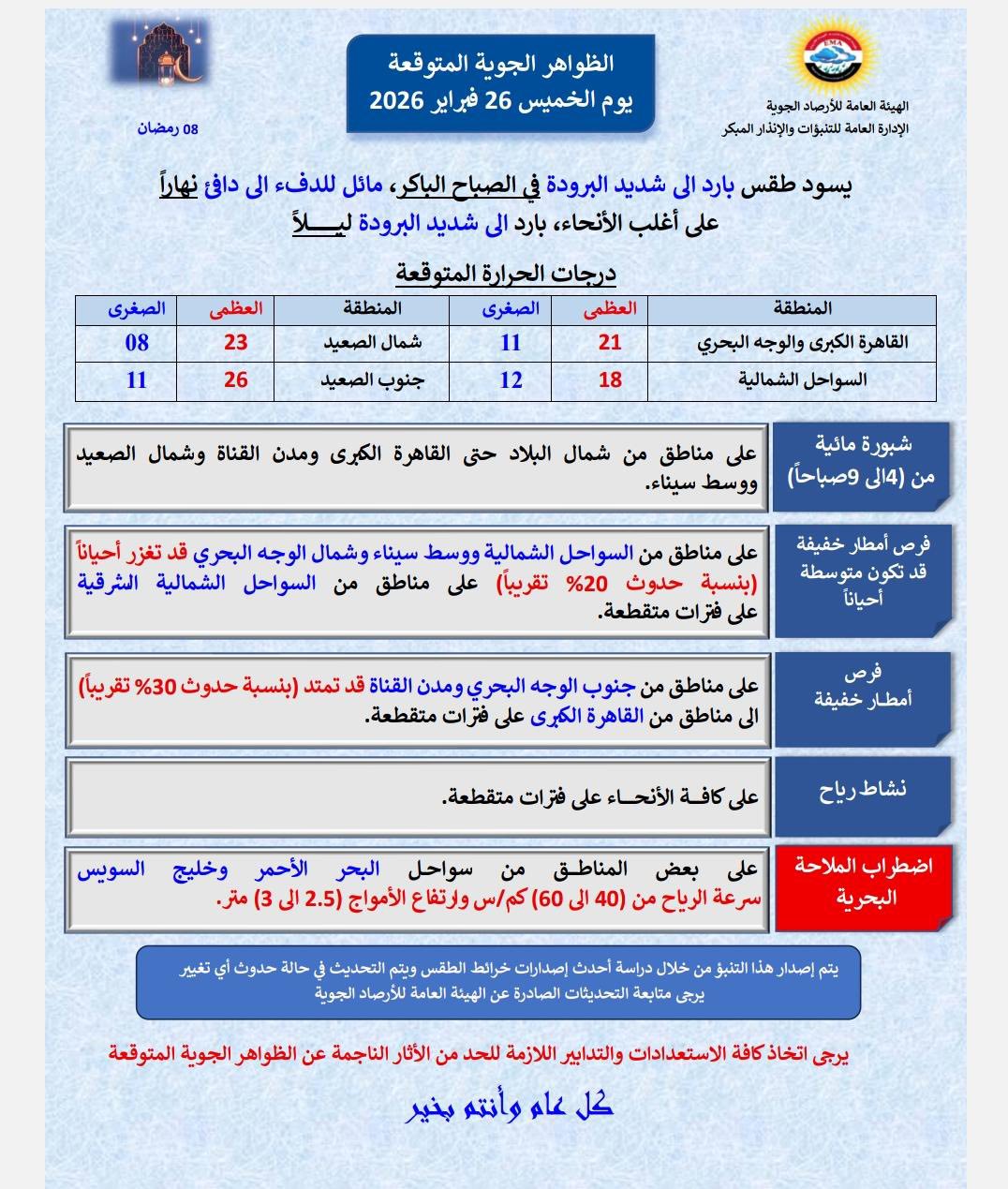 كشفت الهيئة العامة للأرصاد الجوية عن حالة الطقس والظواهر الجوية المتوقعة اليوم الخميس 26 فبراير 2026، مشيرة إلى أن البلاد تشهد طقسًا باردًا إلى شديد البرودة في الصباح الباكر، مائلًا للدفء إلى دافئ نهارًا على أغلب الأنحاء، بينما يسود طقس بارد إلى شديد البرودة ليلًا.