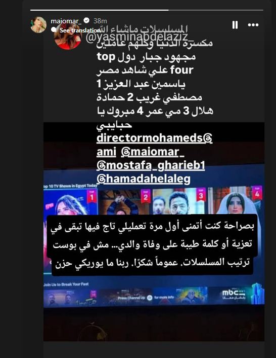 خرجت الفنانة مي عمر عبر حسابها الخاص علي موقع التواصل الاجتماعي إنستجرام، وردت على تصريحات ياسمين عبدالعزيز بخصوص الأعلى مشاهدة خلال رمضان.