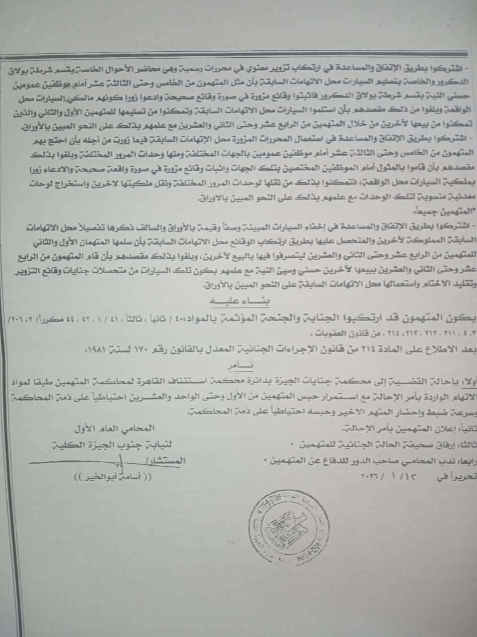 حصل "الرئيس نيوز" على نص الاتهامات وأمر الإحالة الصادر من نيابة جنوب الجيزة الكلية بإحالة 22 متهما إلى المحاكمة الجنائية، بينهم 21 متهما محبوسا وآخر هارب، لاتهامهم بتكوين تشكيل إجرامي تخصص في تزوير توكيلات بيع السيارات وتقليد أختام شعار الجمهورية الخاصة بمكاتب الشهر العقاري ووحدات المرور والنيابات، ثم استخدام تلك المستندات المزورة للاستيلاء على سيارات مملوكة لآخرين وإعادة بيعها، وذلك في واحدة من القضايا الجنائية المعقدة التي تكشف حجم الجرائم المنظمة المرتبطة بسوق السيارات في مصر.