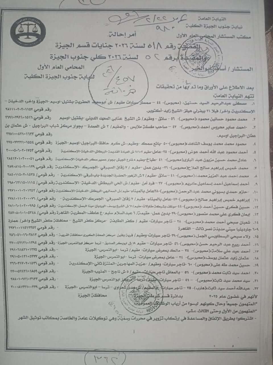 صدر أمر الإحالة عن المستشار أسامة أبو الخير، المحامي العام الأول لنيابة جنوب الجيزة الكلية، بعد تحقيقات موسعة كشفت تفاصيل نشاط التشكيل الإجرامي.