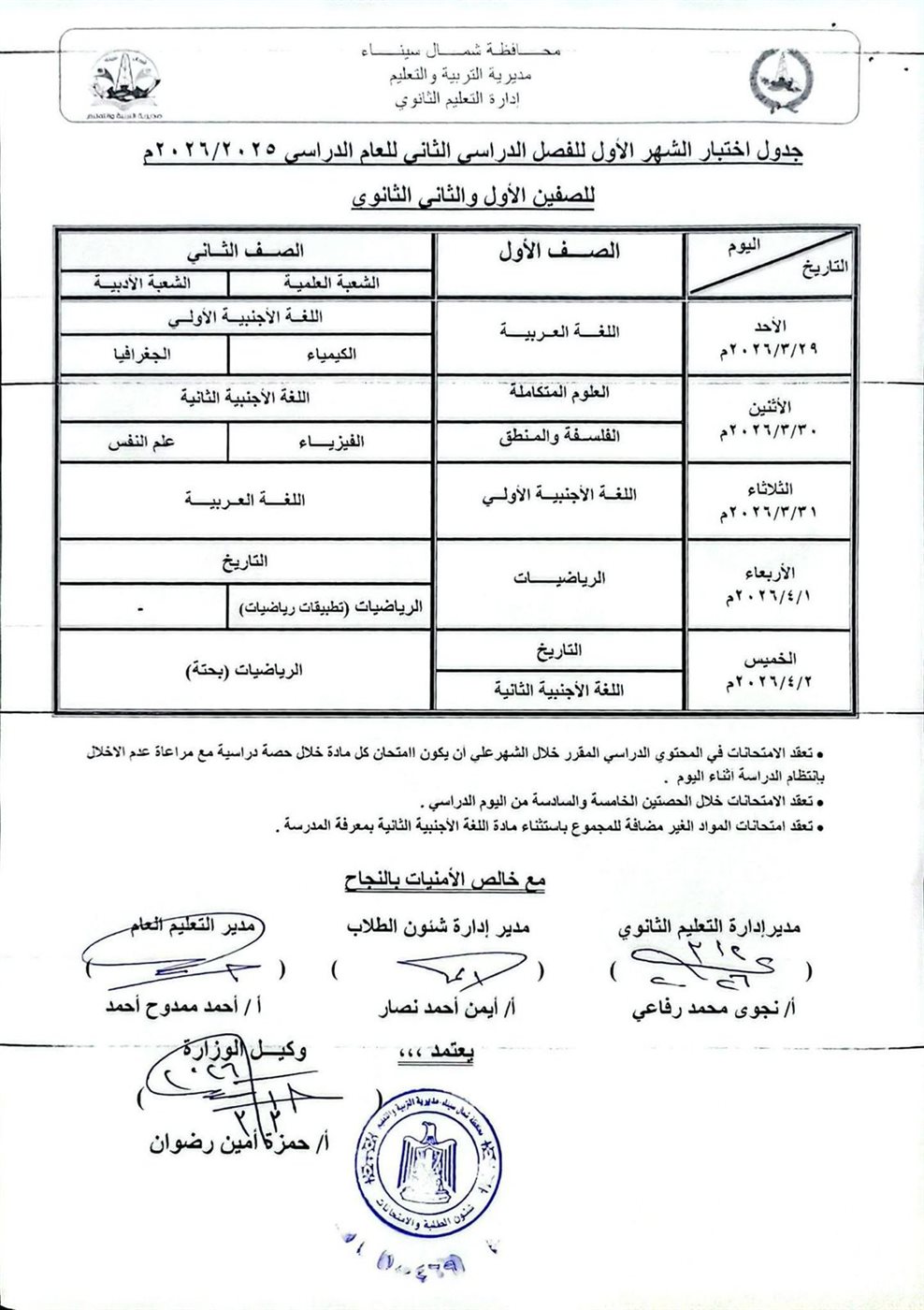 كما قررت الوزارة أن تبدأ امتحانات شهر مارس 2026 يوم الأحد 29 مارس 2026 في المديريات التعليمية التي تعمل مدارسها بنظام الدراسة ابتداءً من يوم الأحد.