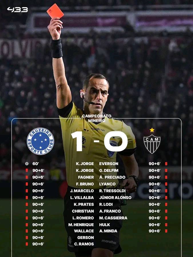 شهد نهائي بطولة ولاية ميناس غيرايس البرازيلية بين كروزيرو وأتلتيكو مينيرو أحداثًا تاريخية غير مسبوقة، بعدما تحولت مباراة "كلاسيكو مينيرو" إلى واحدة من أكثر المواجهات إثارة للجدل في تاريخ كرة القدم، بسبب العدد القياسي من البطاقات الحمراء التي أشهرها الحكم في اللقاء.