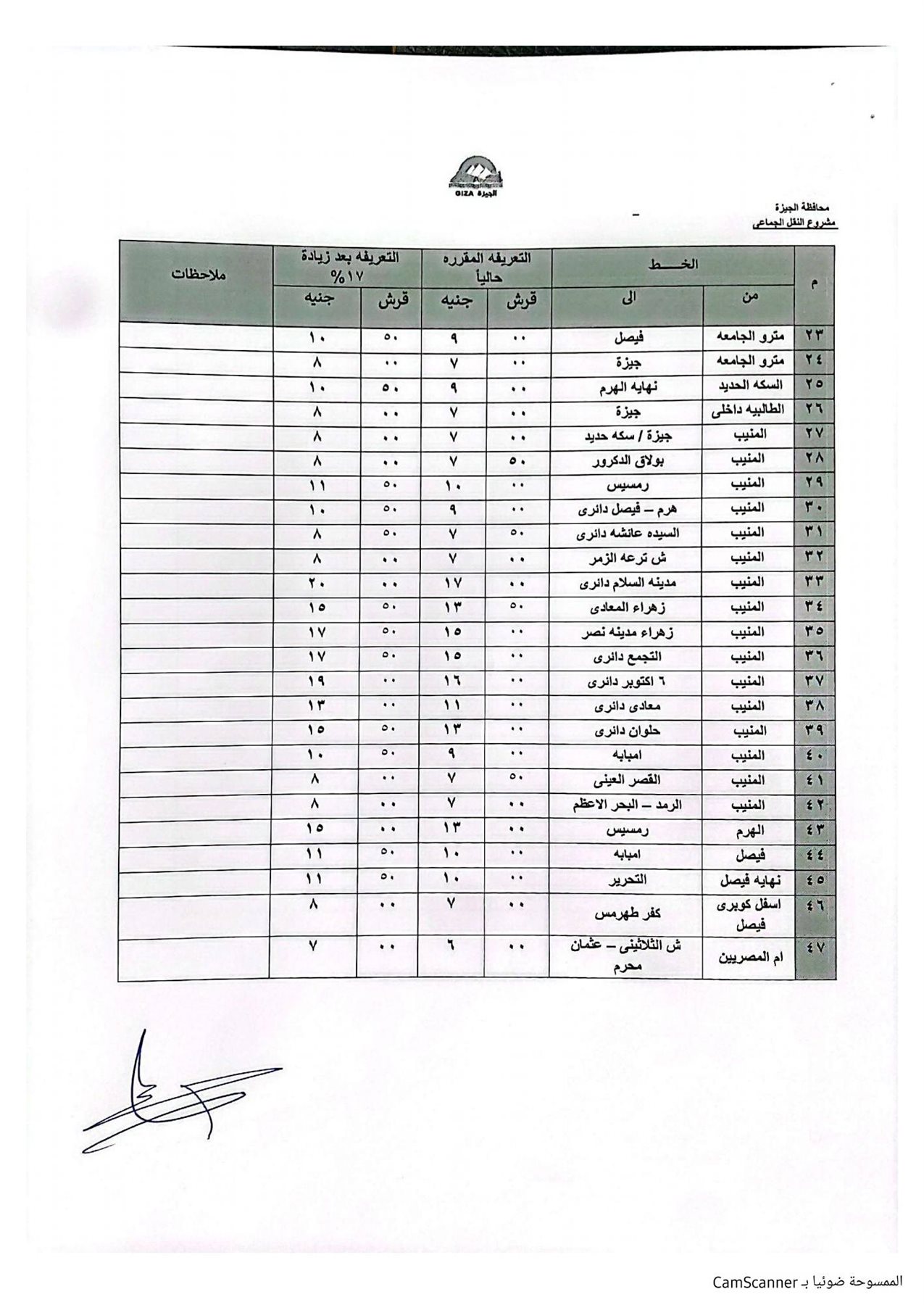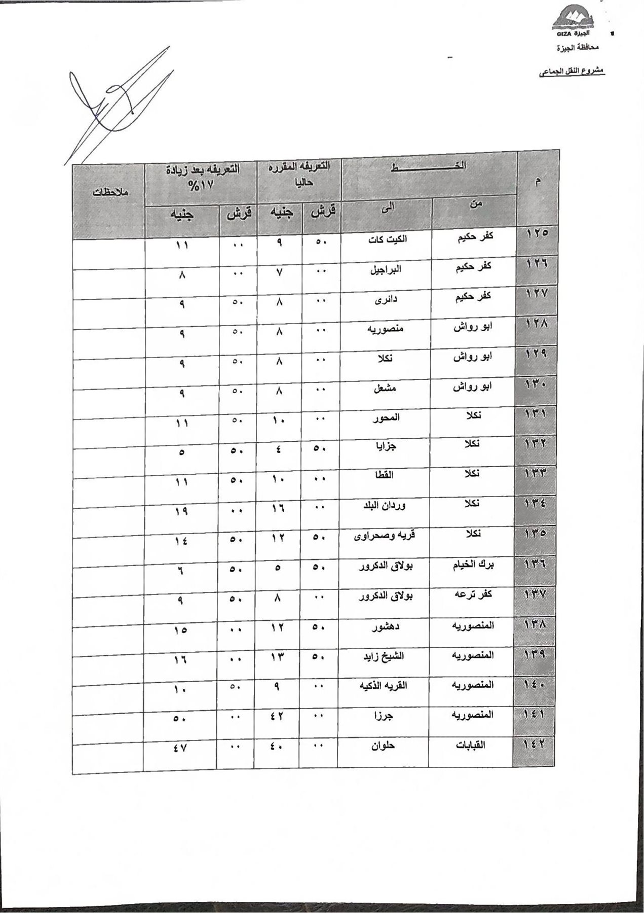اعتمد الدكتور أحمد الأنصاري محافظ الجيزة، التعريفة الجديدة لسيارات السرفيس والنقل الجماعي الداخلية والخارجية والتي يتم تطبيقها اعتبارًا من اليوم الثلاثاء وطبقًا للجداول المرفقة، في ضوء قرار لجنة التسعير التلقائي للمنتجات البترولية بوزارة البترول بتحريك أسعار المنتجات البترولية.